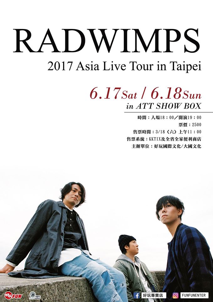 繼 2014 年於華山 Legacy 的 LIVE TOUR,2015 年於 ATT SHOW BOX 的 Asia-Europe Live Tour,經過 2016 年由新海誠導演擔任監督全球暢銷動畫《你的名字》的渲染,RADWIMPS 不僅在日本受到如日中天的歡迎,更是引起全球注目的焦點樂團。