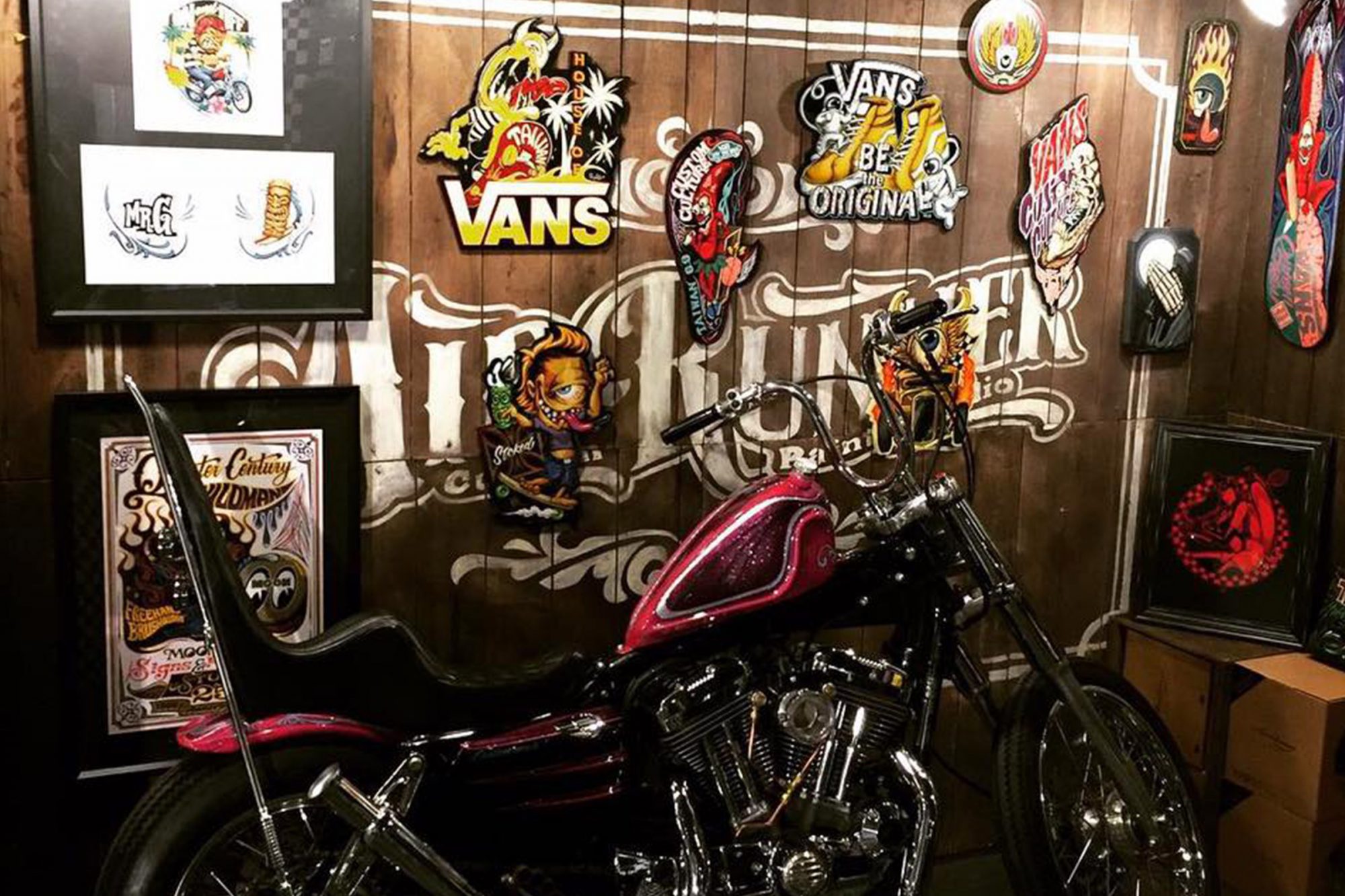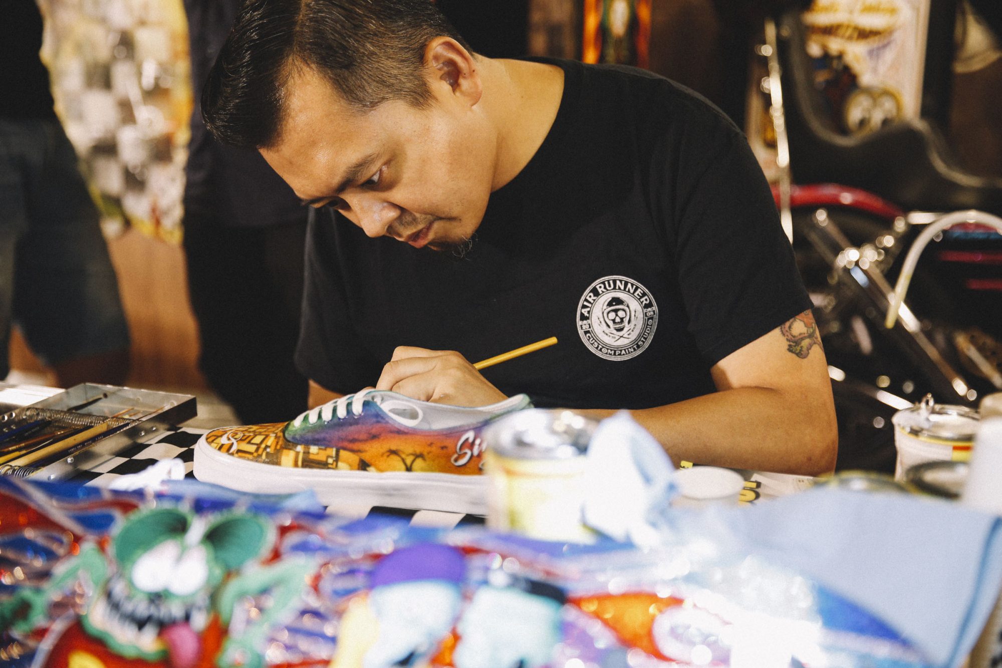 在美式客製文化中,Handpainting Art (手繪藝術)至今仍是相當為人所喜愛的呈現手法。在過去尚未有電腦以及印刷技術進行協助,在招牌、看板、車輛等物件,皆需要長時間的人力與專注進行手工繪製,而原生自汽車改裝的 Kustom Kultrue 屬於美式客製文化的一環,在孕育 Vans 而生的南加州更是不可或缺的文化要角。業界稱為“大飛”的張迪瑋所率領的 AIR RUNNER,可說是台灣 Kustom Kultrue 第一把交椅。不僅孕育出許多當代傑出的彩繪職人,大飛精湛的彩繪技術更是風靡台、日、美,重現 70 年代美式機車的彩繪風采成為 AIR RUNNER 最亮眼的魅力所在。於本屆 House Of Vans 活動,AIR RUNNER 除將工房移植至會場,並由職人們接力進行 Vans 鞋履的手繪創作,成為當晚鎂光燈的焦點之一。