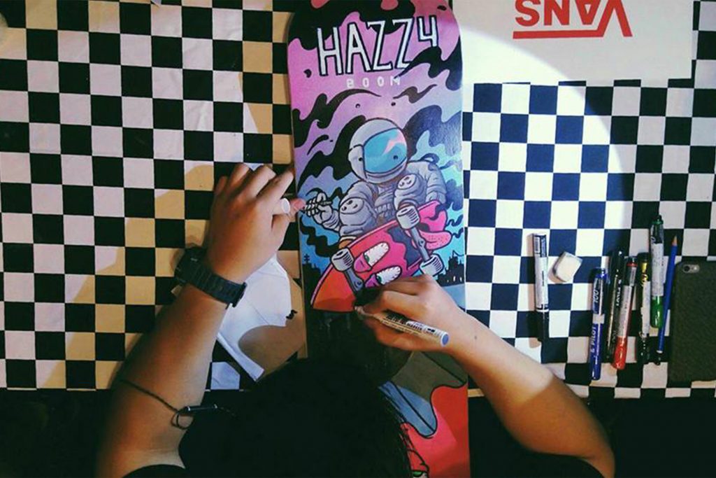 球鞋插畫家 Hazzy,過去從 Kicksonfire 網站以及知名球鞋藝術家 Dave White 受到球鞋繪畫的啟蒙,將不同的鞋履圖像進行解構,與街頭文化相融,充滿自我風格的圖像識別,讓 Hazzy 創造的鞋履繪製熱潮,不僅延燒至 Instagram 與國外球鞋資訊網站,更曾獲選 RED DOT AWARD 德國紅點設計獎。本屆 House of Vans Taiwan,Hazzy Boom 以經典的 Slip-On 為基底,結合滑板塗鴉呈現富饒趣味的手繪氛圍,再現 Vans 展現自我的原創精神。