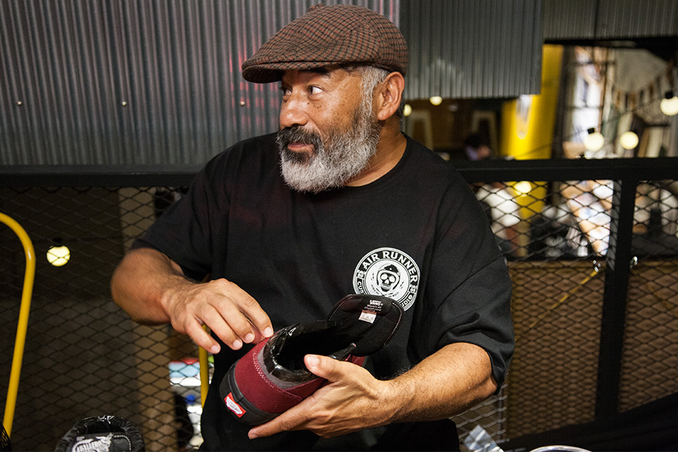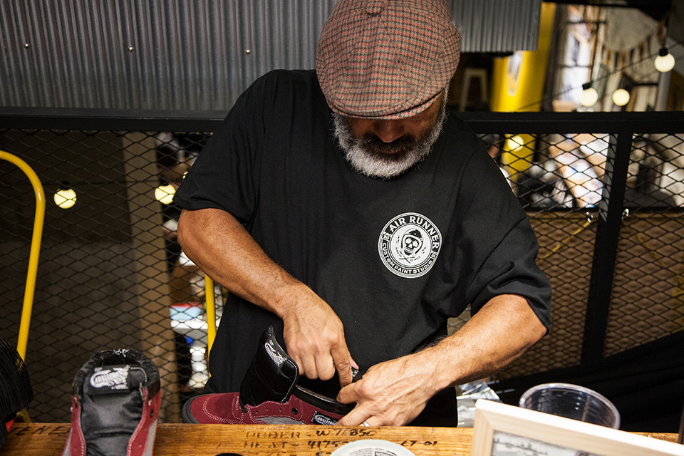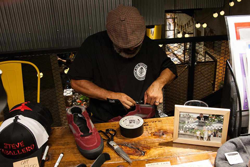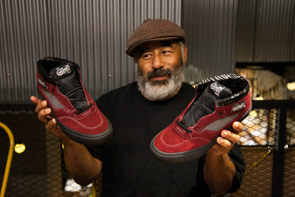 要提到 Vans Half Cab 自然不能忽略 Vans 於 1989 年為 Steve Caballero 推出的選手鞋 Vans Full Cab,這也是 Vans 少數結合選手命名的鞋款。Full Cab 除以勃根地色與黑色為基底,搭配帶有爬蟲類紋理的灰色,也象徵 Steve 的生肖「龍」,近期在謠傳 Kanye West 繼 Adidas 的下一步將是與 Vans 合作時,也曾穿上酒紅色的 Full Cab,讓此雙鞋履再次成為討論的焦點。據 Steve 表示,在當時獲得選手鞋的贊助雖然很好,然而高幫的鞋身並不是方便技巧的施展,因此決定將高幫的部分剪掉,並直接貼上大力膠帶幫助貼合。前後共剪過三雙的 Full Cab,誰知這一剪不僅於 1991 年掀起一陣板手的模仿熱潮,更因此啟蒙了位於新加坡的 Mark Ong,日後成立 SBTG 的輪廓。爾後 Steve Caballero 與 Vans 主理人 Steve Van Doren 建議將低幫的 Full Cab 進行量產,1992 年命名為 “Half Cab” 的第二代選手鞋因而誕生,並成為 Vans 御五家(Sk8-Hi、Old Skool、Era、Authentic、Slip-On)之外,最常受如 Supreme、Gosha Rubchinskiy 等國際品牌青睞聯乘的鞋履,適逢今年為 Half Cab 推出的 25 週年,Steve Caballero 本回的造訪,也為下半年度 Vans 的重點鞋款進行暖身。