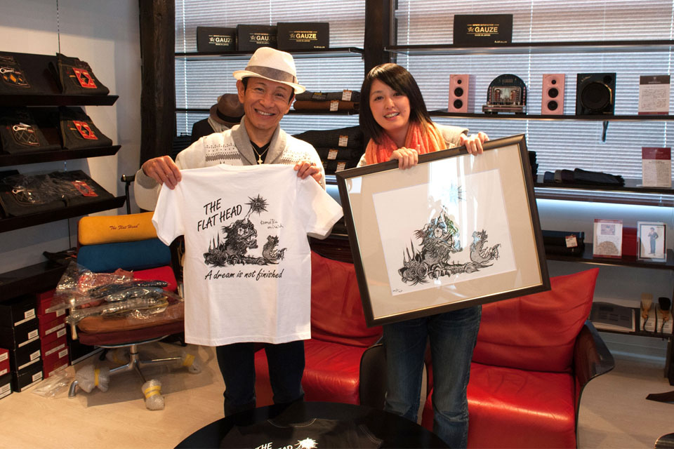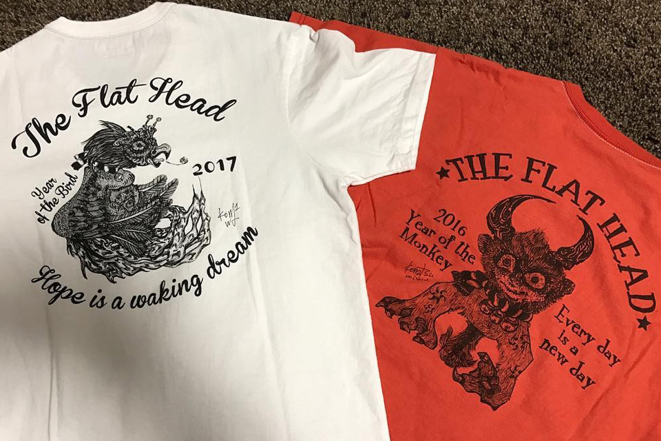 Miwa:我的家鄉是在日本長野縣的坂城町,鄰近坂城町旁的是千曲市,THE FLAT HEAD 品牌就是在此發跡,當年我在坂城町北術館開展的時候,社長小林先生過來看,從閒聊中得知小林先生的理念是將源自長野的優良傳統與特色發揚至全國甚至全球,這個想法與我相當契合,所以就開啟了合作的計畫。目前的聯乘是以「12 生肖」t-shirt 為主題,我也常跟社長講說是不是我們可以做一些其他的企劃,比如製作夏威夷衫感覺也相當合適,希望以後有機會成行。(笑)