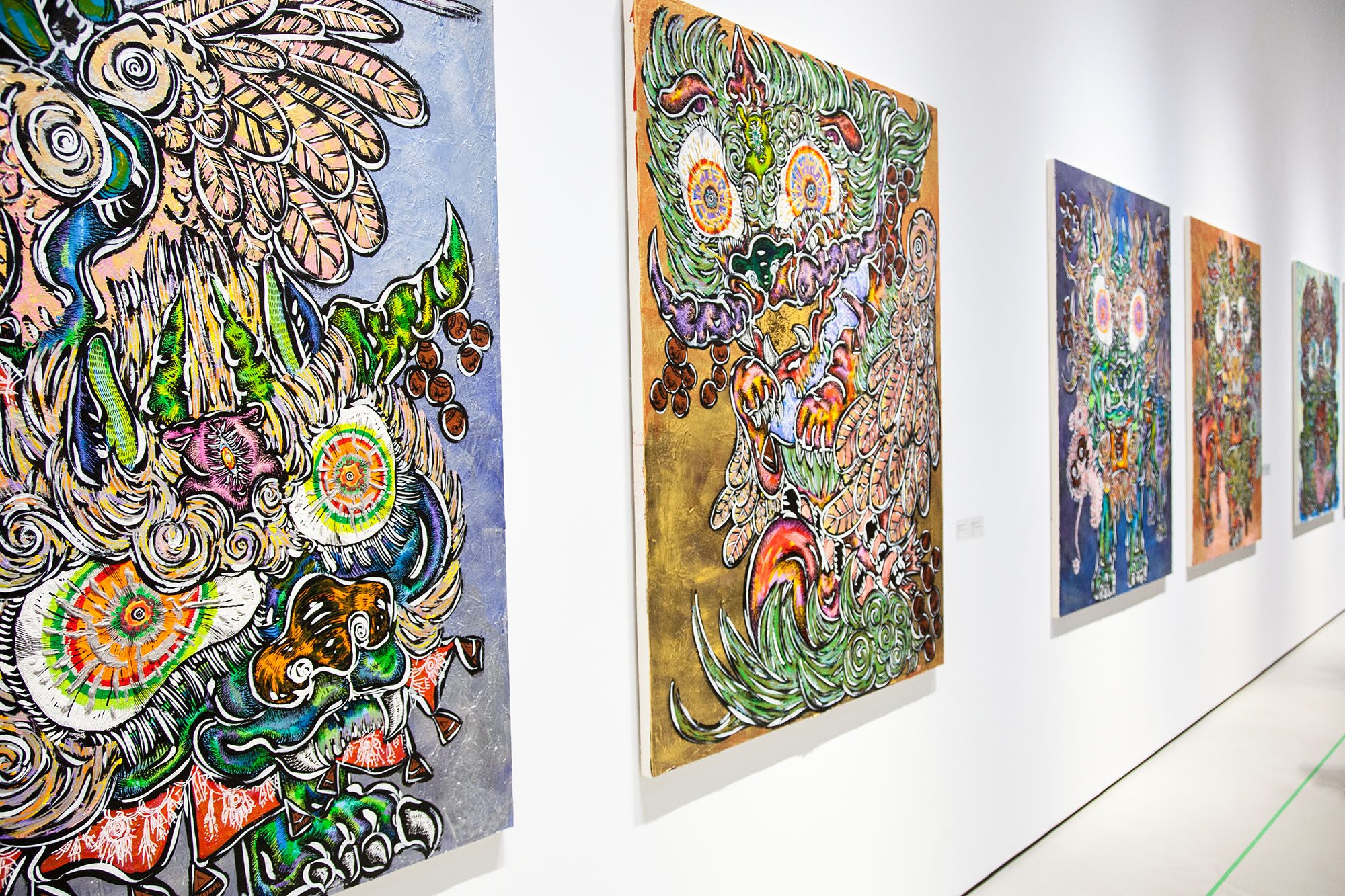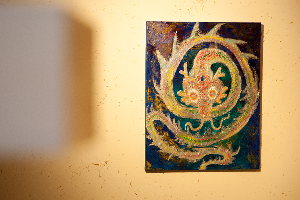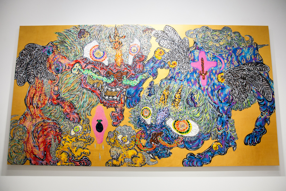 Miwa:這次是我第四次來台灣,會留在這裡一個月進行創作,第三次來台灣時,有感受到自然、土地與人的能量,特別是大地與水的呈現,在腦海裡很自然的出現龍的輪廓,而且是閃閃發亮的色彩感。繪製守護獸時我都是使用黑色的筆觸,然而對於龍的部分是無意識使用了銀色的線條,再加上金色系的色彩,輪廓也比守護獸還細,所產生的作品《台灣水龍》,也是與以往日本作品完全不同。今年來台灣,九月時翻譯小姐有帶我去中和的圓通寺,那邊有隻好大的狛犬讓我印象相當深刻。