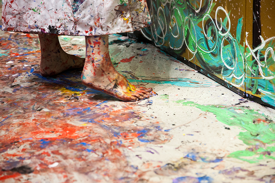 Miwa:創作到很嗨的時候來不及用筆畫,自然的會使用手;不過重要的線條就會用筆下去畫。對我來說人跟人之間可以透過眼神來交流,看到一個人的眼睛相當有力量時,你也可以得到他的力量,所以自然的在繪畫時會出現複數的眼睛。畫畫是非常快樂的事情,常常不自覺旁邊的人覺得我怎麼畫得很快,有些人可能排斥現場創作,但我滿樂意在現場創作給大家看,因為我希望讓大家感受到為畫賦予生命力的一瞬間,同時因為我不會中文,還花了 300 元買了講中文的 App,現場創作也是我與大家進行溝通交流的最好方式。