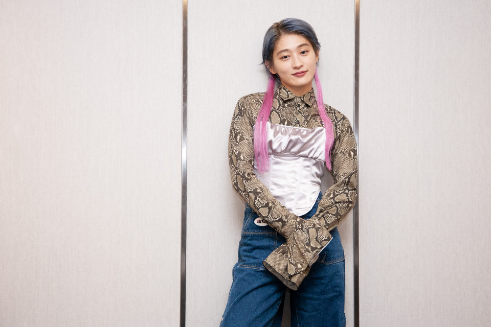 一頭灰綠色俏麗短髮配上兩束桃色的髮尾,蟒蛇紋襯衫、馬甲、豹紋魚口鞋與翻玩橋石輪胎 logo 的 Bitch 喇叭丹寧構築獨到的搭配型格,把玩著杯中的金魚茶包,每一次的輕聲細語就好似《交響情人夢》中的野田妹躍出平面,星期三的康帕內拉 (水曜日のカンパネラ)」主唱 KOM_I (コムアイ) 不負「超級雨女」美名,去年專場巧遇輕颱卡努,記者會午後的暴雨也是相當驚人,對於首次以宣傳身份來台,KOM_I 難掩臉上的興奮直說相當不好意思,也將在空閑的時間多認識台北這個新舊交會的都市。