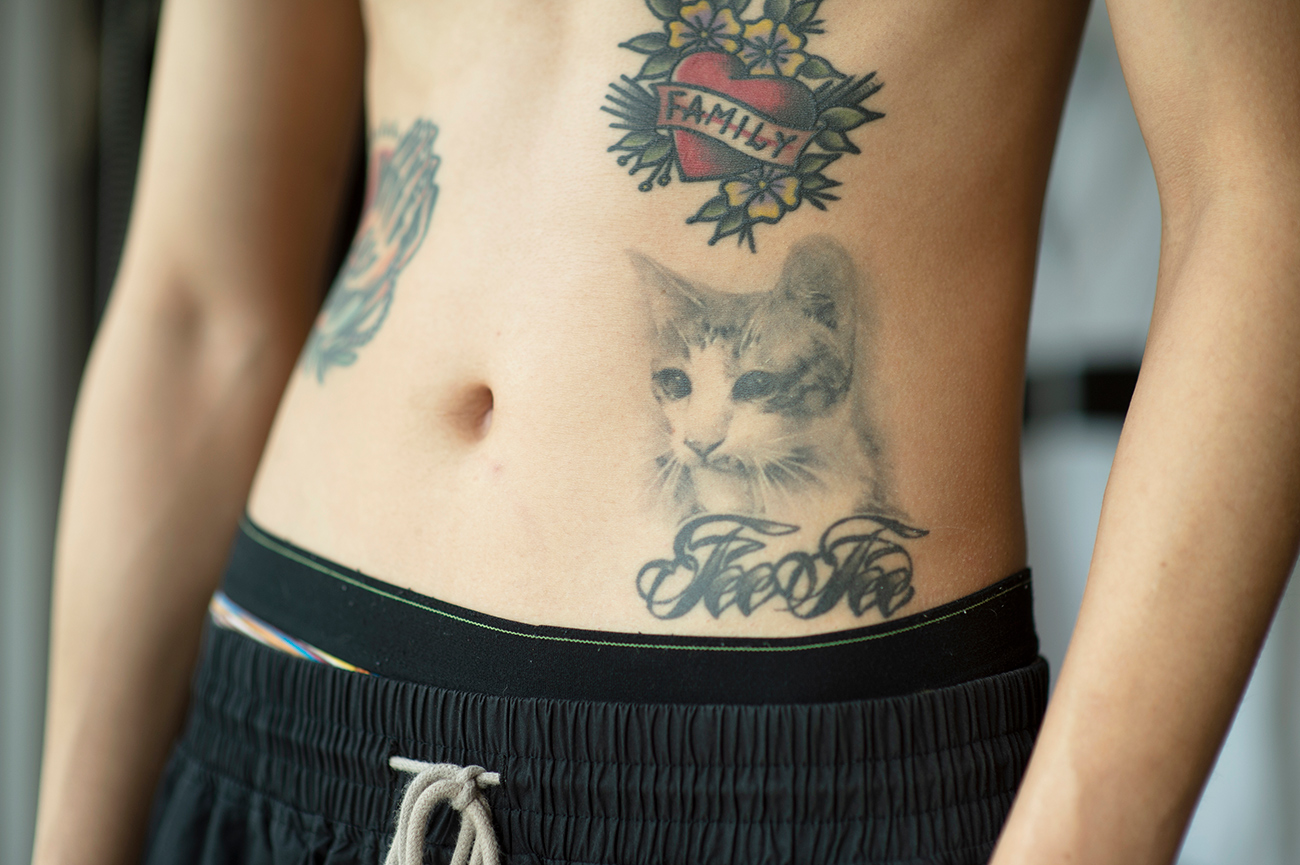 每個刺青對我都是某段時間、某個人事物的記憶,這是我的貓咪,就像牠隨時跟我在一起,刺的超像的。