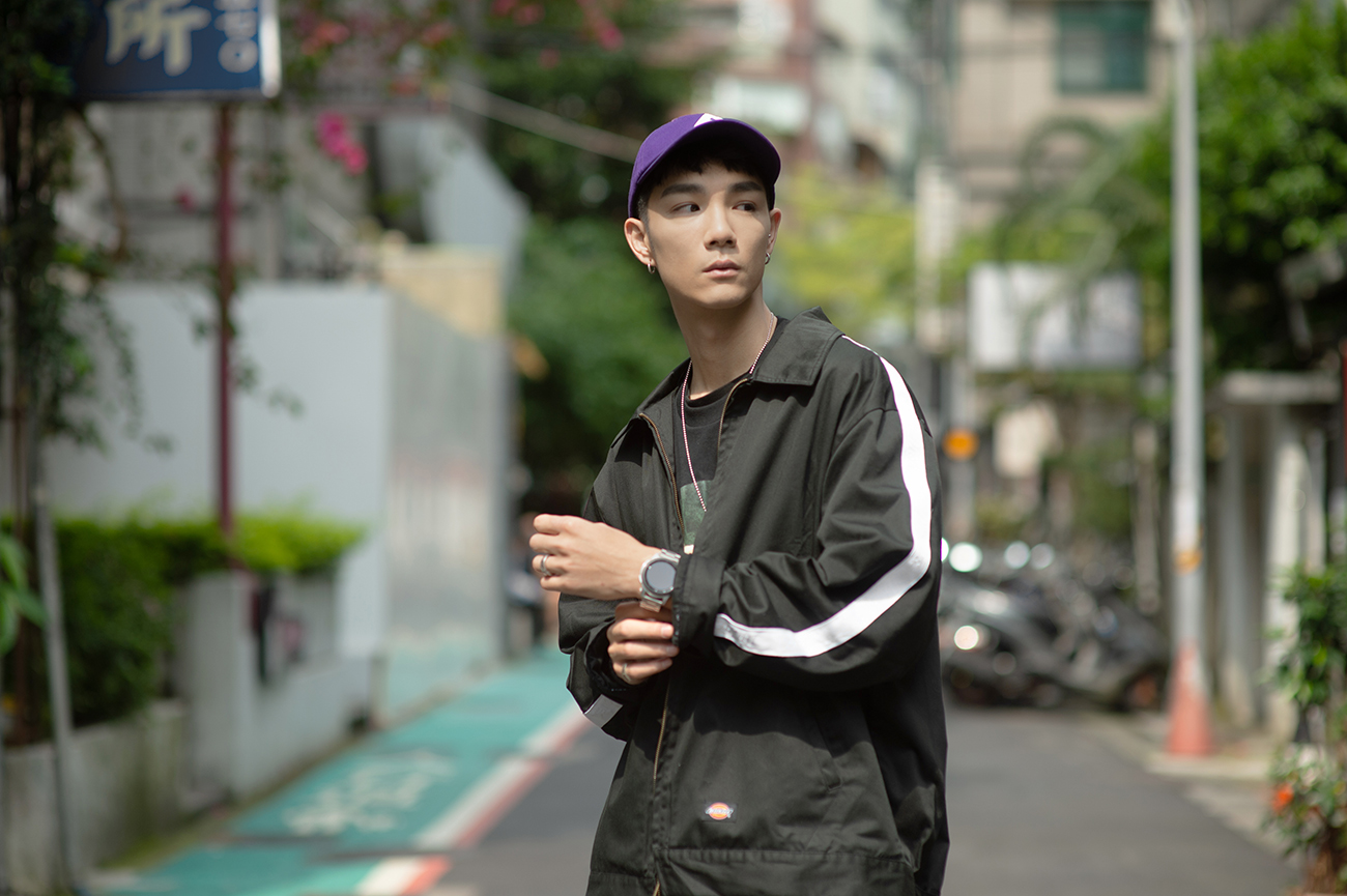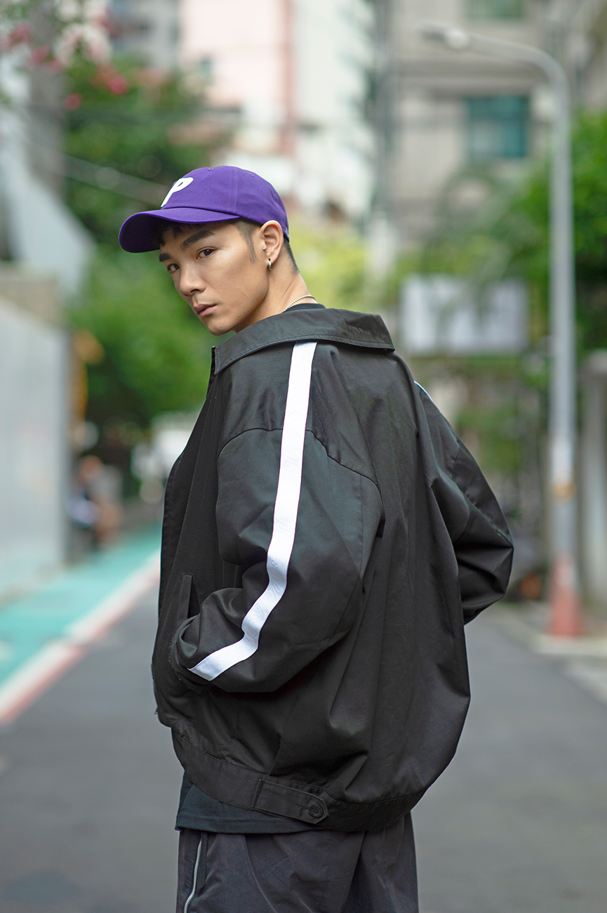 顏色也是金承從視覺改變身型的重要元素,「我很愛黑色,但黑色會顯瘦,我就會運用不是那麼合身的剪裁來調整,今年我想多嘗試亮色系。」金承補充:「因為今天主題是 1980 年代,剛好符合我愛穿 oversize 的喜好,看不清楚身型,搭配的褲子要嘛低、要嘛大,搭配紫色帽子、白鞋,讓整體造型有視覺焦點。」