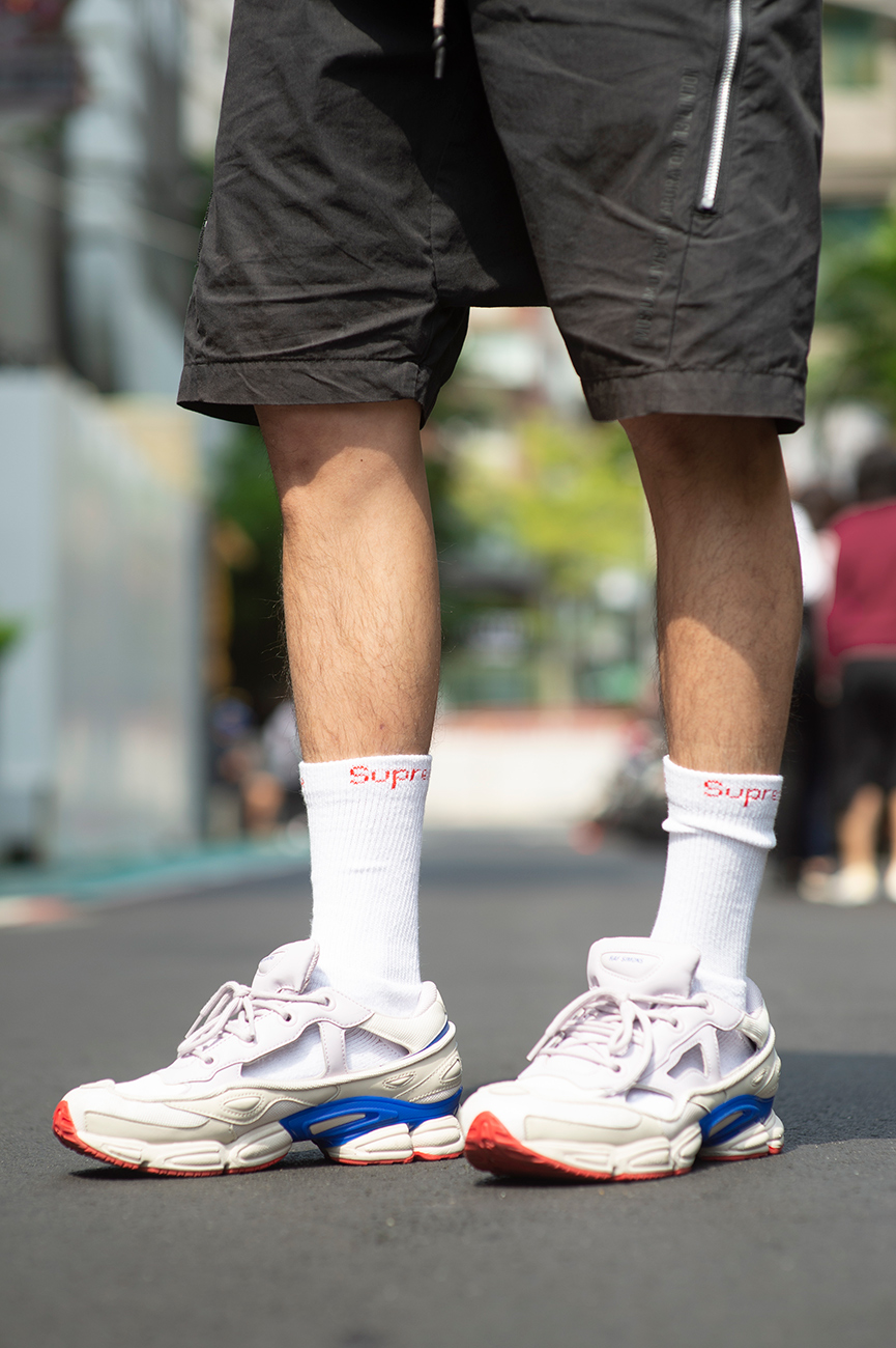 我覺得今年還是要一雙白色球鞋,我穿的這雙adidas Originals與Raf Simons的Ozweego Replicant ,側面鏤空,看起來沒那麼厚重,我最愛它側邊的藍色還有紅底。還有喔,今年夏天一定要一雙小白襪。