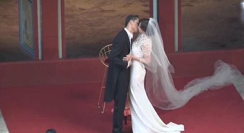 林志玲和 AKIRA 在親友的見證下交換誓詞與婚戒,最後主持人蔡康永宣布「現在新郎可以親新娘」,AKIRA 立刻上前一把摟住志玲姐姐妻子細腰,兩人深吻了長達 10 秒鐘,不只如此,AKIRA 更激烈的不斷移動雙唇,最後情不自禁的緊緊擁抱,讓所有賓客嗨爆了!也掀起了典禮的最高潮。