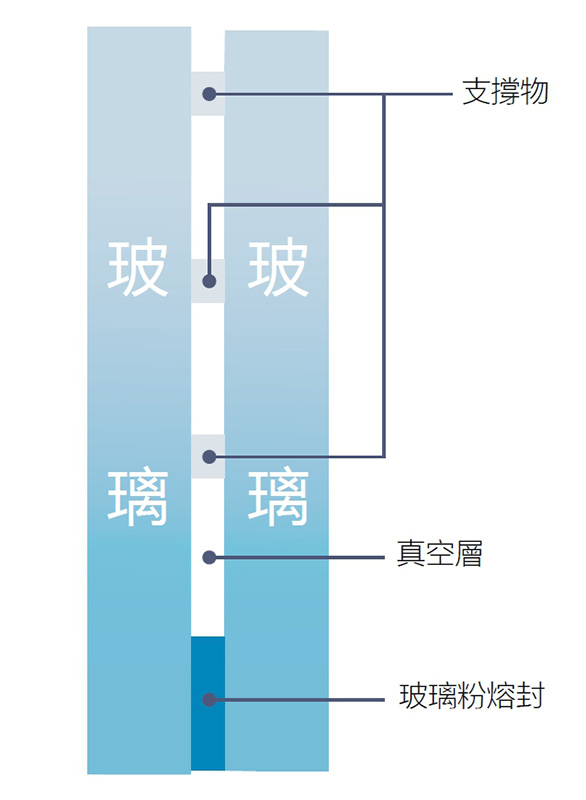 是將兩層玻璃的中間層抽成真空,由於真空層具有優異的聲音與溫度阻絕效果,因此隔熱及隔音性會比一般的複層玻璃為佳;然而,真空玻璃的內層為真空狀態,玻璃會受到大氣壓力的擠壓,而向內壓迫;為了降低玻璃受壓時的變形量,玻璃與玻璃之間,就必須放置許多高度僅有0.2mm的支撐物,以抑制玻璃向內彎陷。