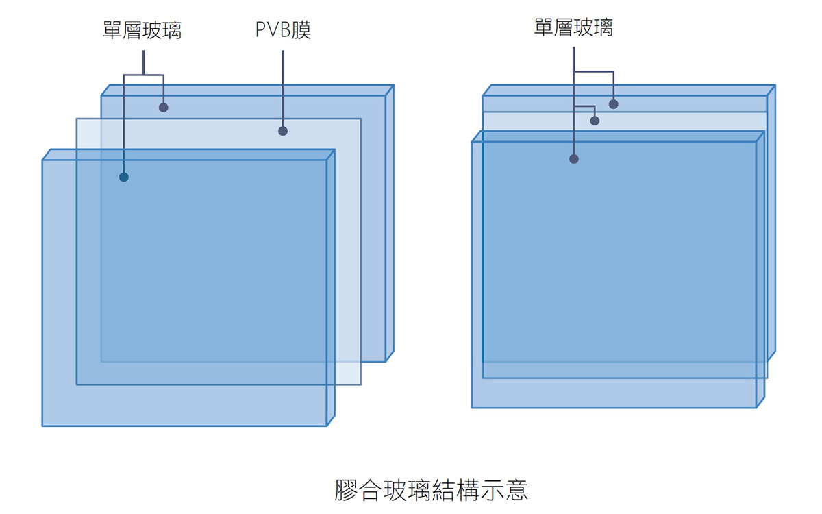 膠合玻璃夾層中黏有強韌的塑料膜(板),故不容易在受到衝擊時破裂貫穿,而碎片四處飛散,因此也具有較高的耐震、耐衝擊、防侵入、防爆、防彈的安全效果。