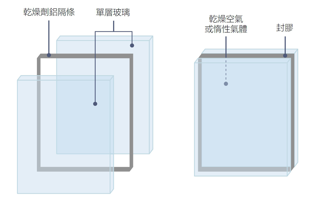 是由兩片以上的玻璃,藉由內含乾燥劑之鋁隔條所組合而成的中空型式玻璃,為確保玻璃中空層的乾燥,玻璃內側會充填乾燥空氣或惰性氣體(通常為氬氣),四周並以封膠方式進行密封;由於中空層的乾燥空氣或惰性氣體相對濕度較低,因此能提供較佳的隔熱效果,並使玻璃中空層與外側玻璃面不容易出現結露。