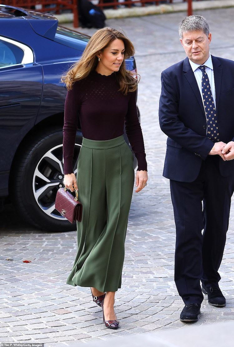 在配色上,凱特王妃除了用反差撞色的墨綠褲款做搭配外,在配件上則運用與上衣的同色系做穿搭,鞋款上他選擇同色系的 Tod’s 粗跟鞋做呼應,在包款上則用已經出鏡過無數次的勃根地紅的 Chanel 包款做對應,從平價的服裝選擇到重複的單品運用,凱特王妃不奢侈的穿搭法則,完全是小資族最好的榜樣!