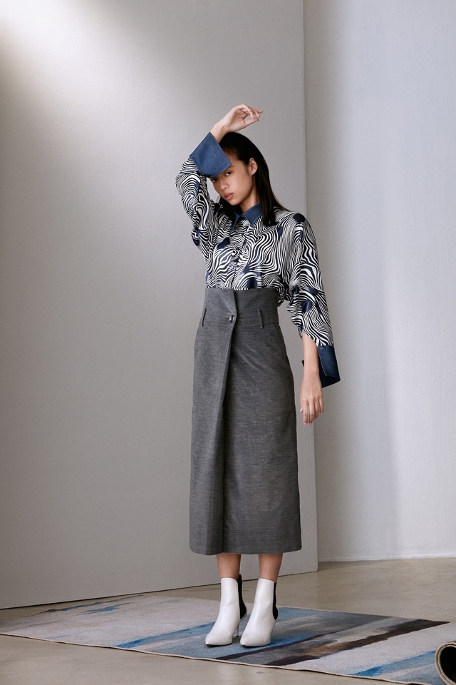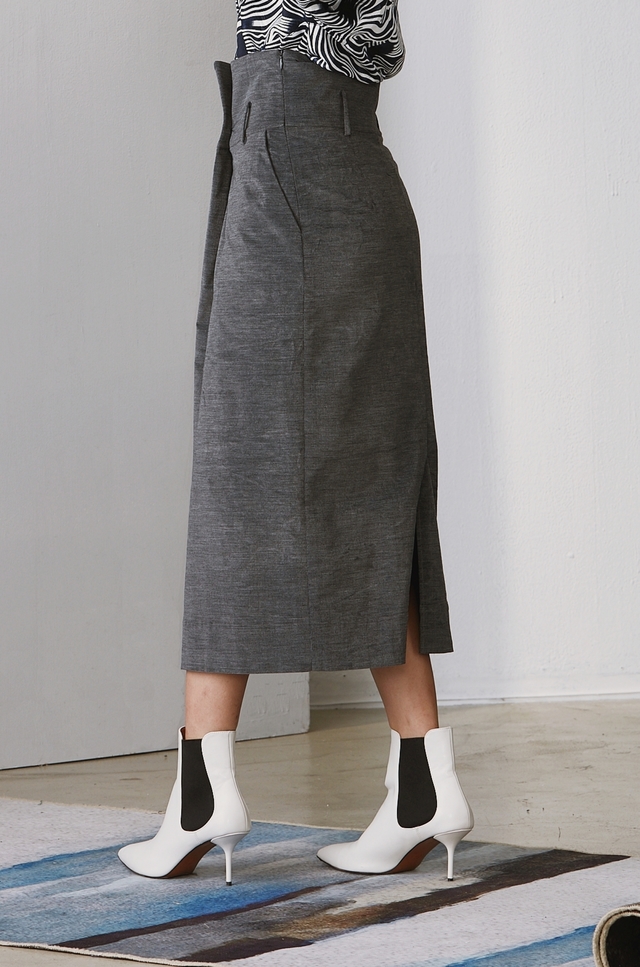 簡約的高腰設計讓穿著時可以透過提高的腰線增強身型的線條感,不過分軟質的面料再加上略帶彈性的設計,即使穿起來較為合身也不會有緊繃感。有些在意臀部周圍線條的話,後方的開岔設計也能適時修飾出下身的輕盈感受。