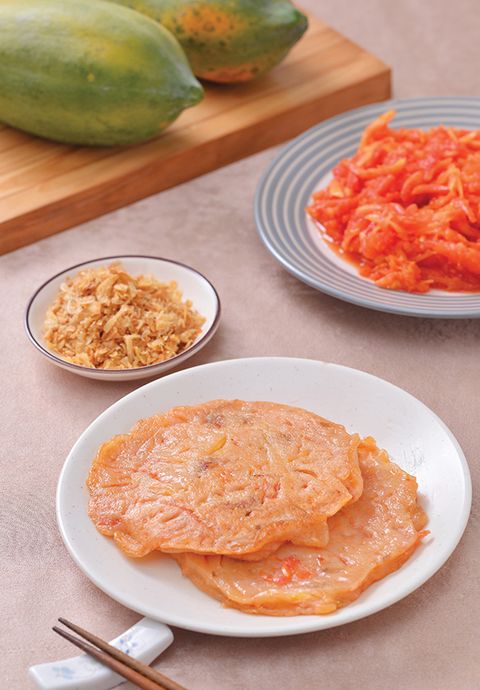 有別於常見的瓠瓜粄或白蘿蔔絲粄,這裡用了質地介於半青半熟之間的紅豔木瓜肉入餡,瓜源取自自家栽種,米漿也從早期用在來米,換成了口感更好的蓬萊米來攪打,並以自己處理的油蔥酥和蝦米提味。米糊煎到表面微微赤脆後,急蘸醬料就入口,鹹甜鹹甜中,引出的木瓜香很是對味,想豪華點,就再加顆蛋變蛋粄。