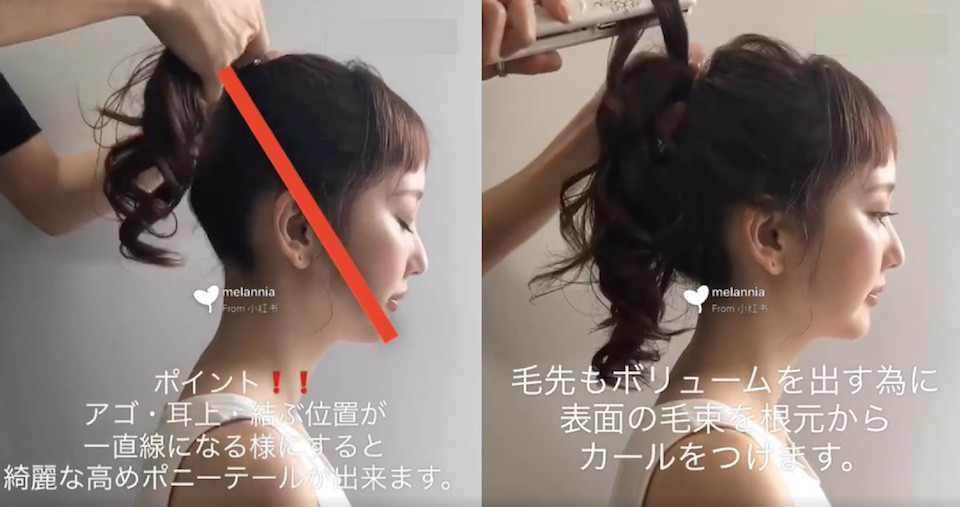 馬尾的位置「從下巴連接耳朵,再到髮圈」是最佳黃金比例!在這條線上所綁出的馬尾最最顯嫩,學生感滿分!同時也能透過後續抓鬆的頭頂頭髮,營造出飽滿的頭型,達到瘦小臉的效果唷~