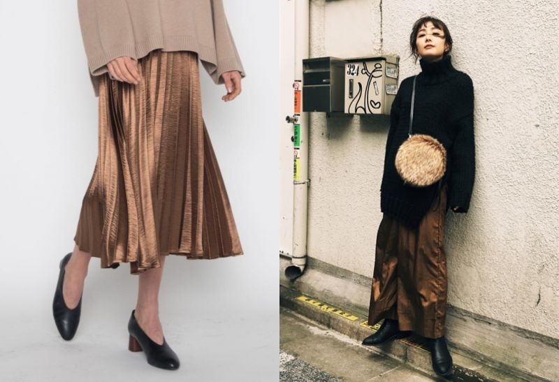 針織毛衣配上裙子可以,但是具有光澤感的面料其實才是最合適的選擇!撇開短版針織衫和鮮豔色彩,若你今天是要穿上低飽和的及腰或超過臀部的針織衣,那麼像絲絨、緞面等這類的裙子才能將整體的沈悶厚重一掃而去。
