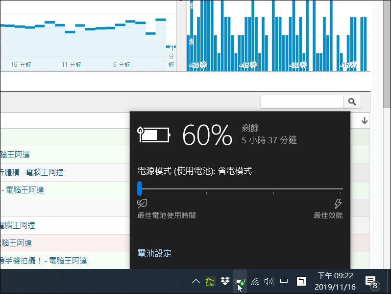 接著阿達以開啟Google 流量分析頁面,實際模擬持續上網與使用雲端服務的情境續航表現(設定最佳電池時間,螢幕解析度 4K、亮度 50%),由 100%到 10%約使用七小時預估至少有7.5小時續航表現: