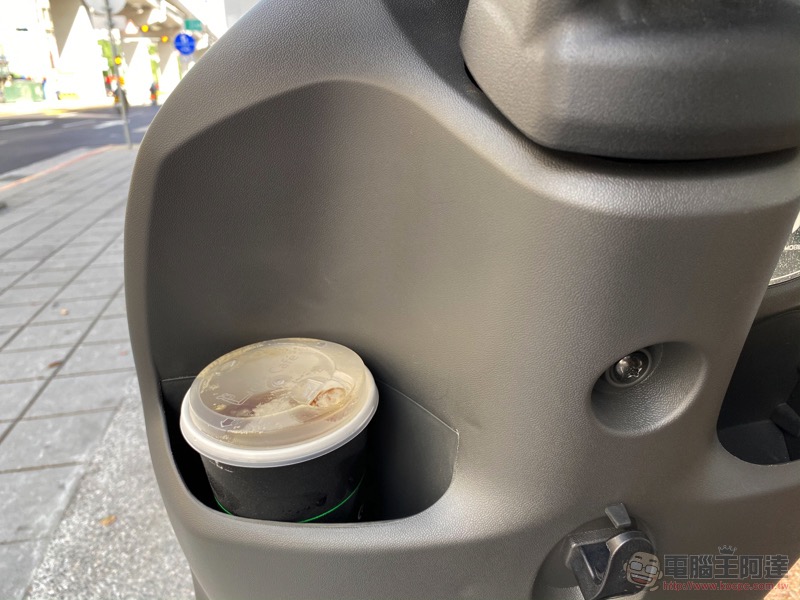 不得不說,借測的這段時間,出門買便當真的會二話不說唯一選擇 Ai-1 Sport 出門。畢竟這前置物要塞抹布等一般生活用品真的是綽綽有餘,下圖這杯飲料真的完全難不倒它(輕鬆!):