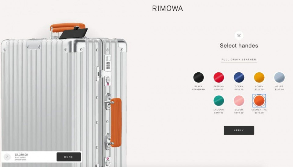 還在猶豫到底要海洋風、還是精簡質感風嗎?RIMOWA官方網站推出了客製化服務,簡直就是為了選擇困難症的顧客量身打造啊!以經典款RIMOWA Classic作為原型,從一開始的皮革握把,就有8種色系可供選擇~