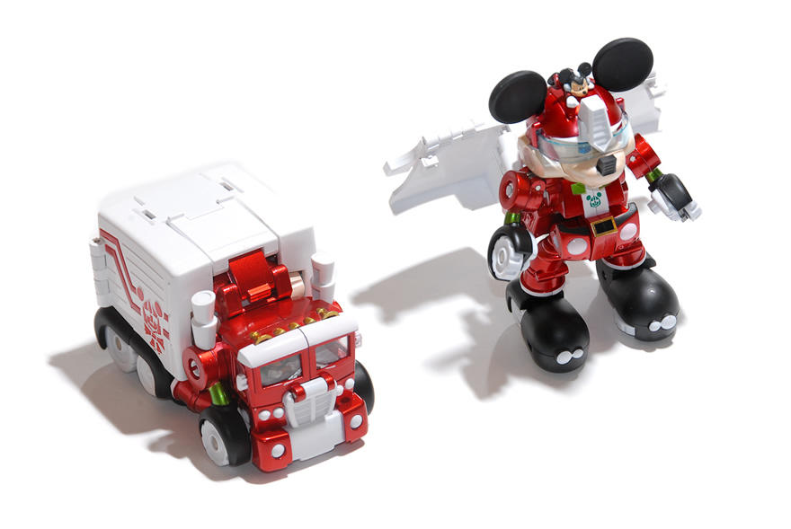 米奇也化身變形金剛,打敗邪惡首領,而且特別在聖誕節把自己打扮的紅通通的樣子,要跟大家一起過聖誕節,俏皮的車頭、主體以紅色的塗裝,以及綠色及白色的點綴,讓整個車體洋溢著節氣的喜氣,婉如聖誕節可以看到米奇變身幫小朋友們快遞禮物。而最棒是的這款的產品細節,不但有許多強調線條的設計,在頭頂上還有一隻小小米奇,當米奇變身後,透過連動裝置,會把小小米奇送進車子駕駛座上,而且連小小米奇的塗料也不馬虎,是非常精緻,值得推薦的好禮物。