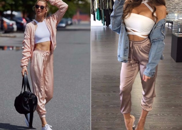 緞面褲相較其他材質,很難找到與它能互相協調的上衣,最簡單方式就是「全身緞面」出場,這樣看起來就會很時髦。名人喜歡貼身背心下搭緞面寬褲,襯托修長身型,走路也有風。