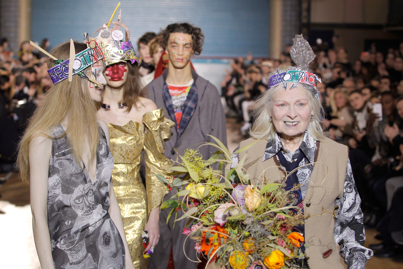 英國龐克時裝品牌 Vivienne Westwood 2017 秋冬要將倫敦男裝周的秀獻給男人與女人。一個備受父母疼愛照顧的幸運年輕女子,她聰慧、充滿藝術性又熱愛冒險,希望這個傢伙在生活中也有同樣的機會。他們熱愛我們的衣服,我們是一個高級時裝公司,一個快樂的公司,技術熟練、勞力密集又帶有手工藝術性,特色之一是經由我們的剪裁理念,大量生產的服裝看起來像高級訂製服。她和他對於跨性別服裝與相互交換衣服樂此不疲,「少買一點、慎選所買、使之永存」這個購衣觀念可以限制地球資源過度開發。她和他加入了知識份子團結組織(IOU)而且越來越恐懼氣候變遷全球暖化。我們戴著紙皇冠,誰是我們的統治者?我們要人民的力量與民主的統治,我們要一個負責任的政府,對人民負責而非對銀行和集團壟斷負責,阻止氣候變遷。
