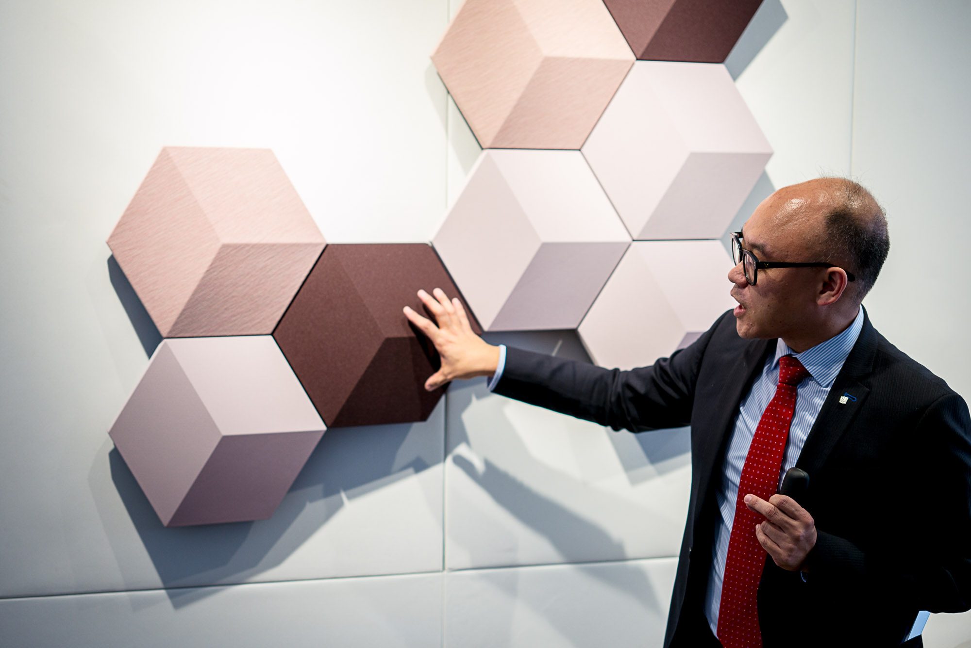 今日另外一套體驗的系統是讓人驚艷的 BeoSound Shape 系統,掛在牆上的一個個蜂巢狀飾版下是完整的揚聲器系統,布料包裹下的可能是負責主控的 BeoCore、高低音單元或者是改善音場的的制音器, 是 B&O BeoSound Shape 的設計師 Øivind Alexander Slaatto 費時三年整合了相關技術的心血,這一切回歸到他工作室的聆聽環境,雖然擁有很棒的採光但是聲學條件卻是很差,想要擁有一套音響系統能夠適應各種室內環境的需求成了設計師本人亟欲達成的任務,藉由創新的六角形構造,B&O SoundShape 系統讓揚聲器與改善音場的制音器(damper)結合,讓視覺與聽覺都得到更沈浸式的體驗,而這背後所需的各種科技如無線串流、或是依據你的使用環境去客製尺寸、配色甚至是排放位置的 B&O SoundShape 客製規劃系統,都擁有大量的科技含量在內,藉由 B&O 以「家」為本的設計訴求,藏在十種不同配色布料下的一項項技術都讓你覺得科技聽起來更有家的感覺。