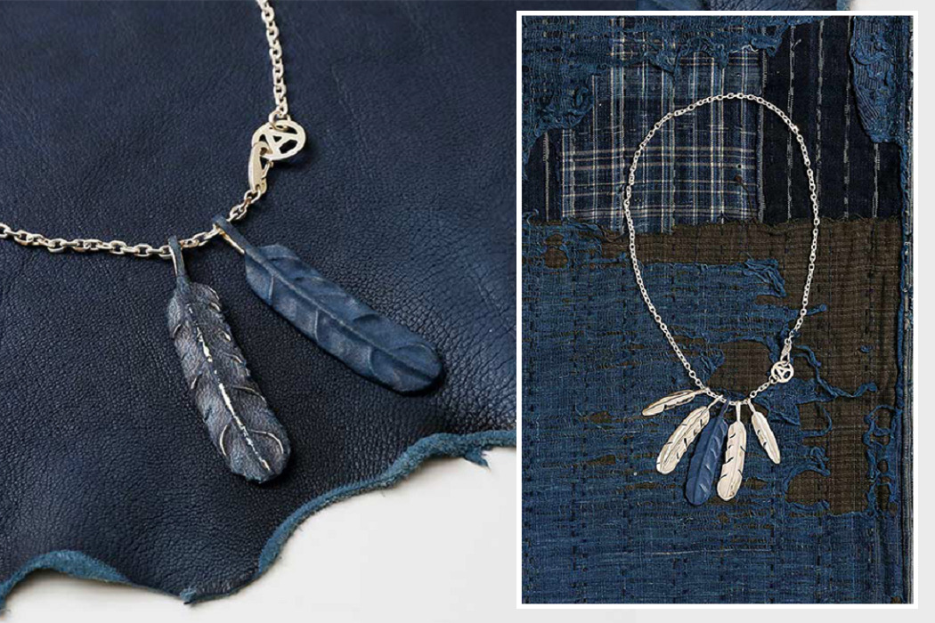 JAM HOME MADE 和 NAKED FEATHER 共同作品之所以會稱作裸羽,是因為面無任何紋理處理,用最原始的狀態示人,而材質除了 18k 金、925 純銀外,更開發塑膠基底裹上一層蠟。與 FDMTL 的合作則用羊毛藍染皮革包住銀羽,經過使用摩擦後會漸漸露出皮革下的金屬質地,雖說這並非 JAM HOME MADE 首次加入皮革元素,雙方也早在 2013 年有過聯名,不過藍染羽毛確實讓人眼睛為之一亮。