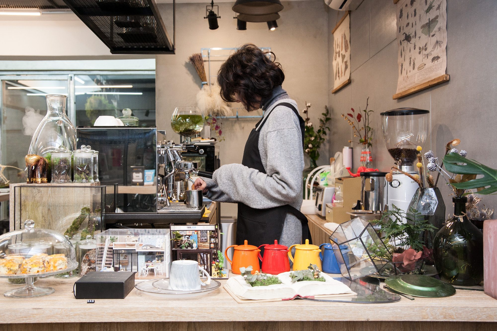 另一面以花藝氣息建構的飲品區,提供了現泡飲品,每日手工現作甜點,在一杯飲料的時間藉由 ToolMAN 營造的舒適感,適時舒緩等待檢測修理的不安。開放式的空間未來也將結合花藝、展覽、座談、蘋果的相關教學,甚至空拍機的操作課程,增加 ToolMAN 複合式空間的豐富度。