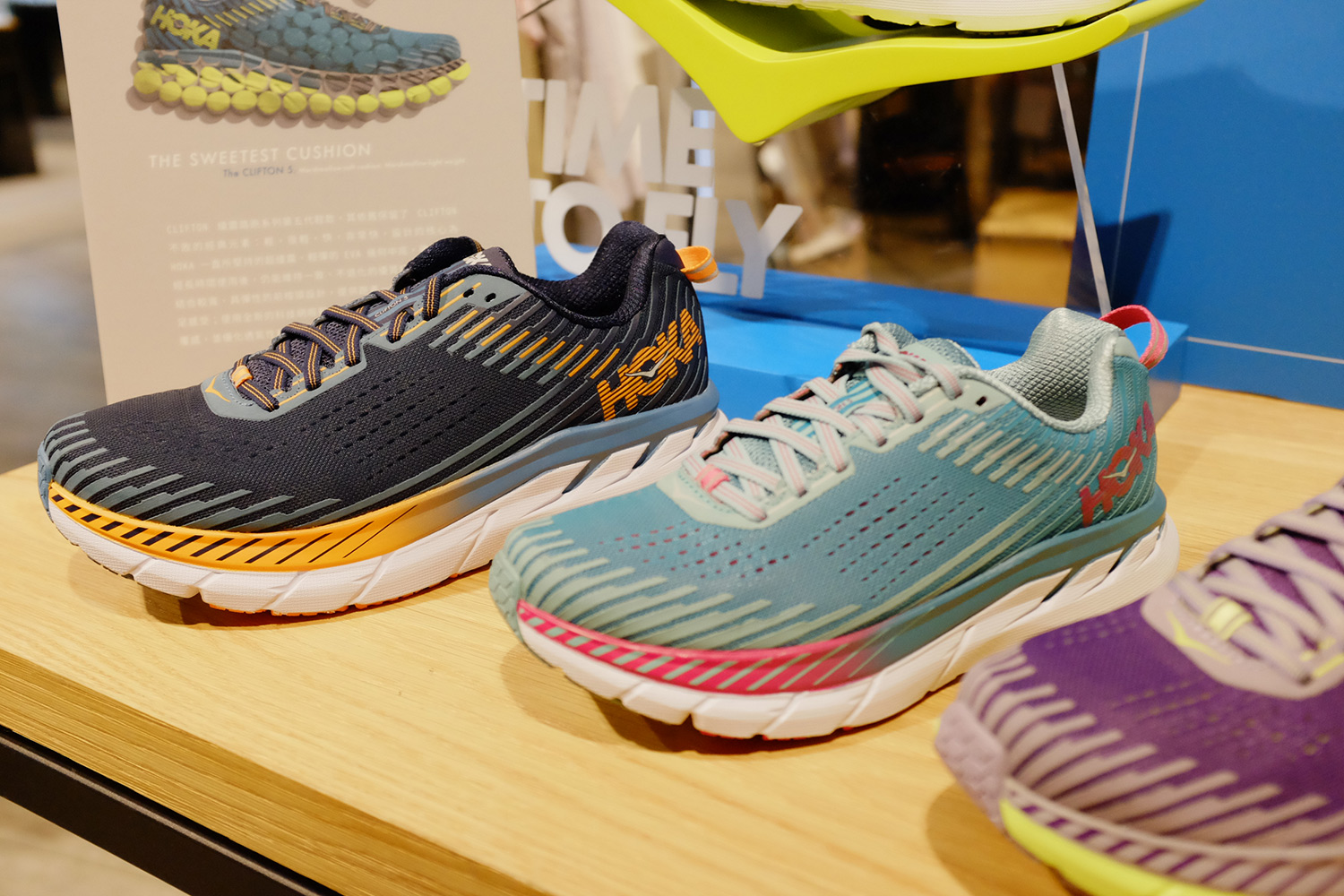 來自法國的 HOKA ONE ONE,其創辦人 Nicolas Mermoud 及 Jean-Luc Diard 本身即是超馬跑者,將多年路跑的經驗,開發出適合跑者的厚底跑鞋,而外觀厚底看似笨重的它,實際拿起來卻意外輕盈,流線型的鞋身加上弧形鞋底,也意外頻繁的出現在穿搭型人腳上。店裡有引進了多款款式可以讓大家試穿及嘗試與服裝的搭配性,像是第五代的「CLIFTON 5」有著多款顏色選擇,科技網眼鞋面在楦頭上有線條壓紋補強設計,穿著時可以擁有透氣感極舒適感。