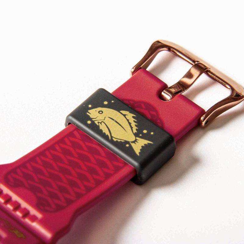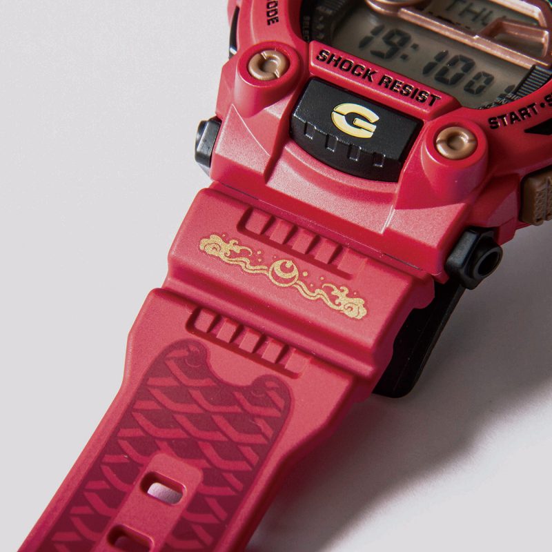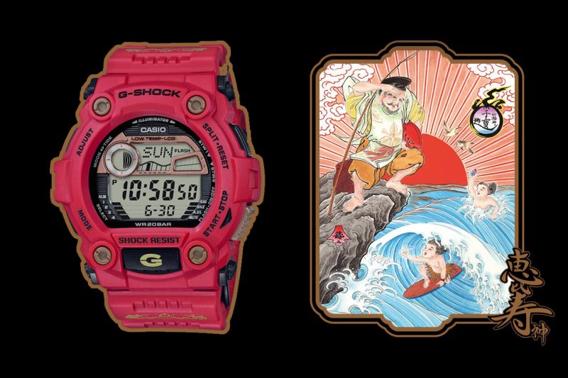 融合日本本土宗教和佛教而延伸出的日本神話「七福神」,分別代表著惠比壽、布袋、辯才天、毘沙門天、大黑天、壽老人和福祿壽七位神明,根據仁王護國經,祭拜這些神明就能避免七種災禍。G-SHOCK 這次找來當代藝術家,將七福神融合現今生活型態,像是滑板、衝浪、BMX、霹靂舞、足球等活動,而率先上市的錶款為惠比壽神,以G-SHOCK G-7900 為設計基礎,外觀利用象徵福氣的紅色為基本色調,錶帶則印上鯛魚鱗片,靈感來自惠比壽常見手抱著鯛魚圖紋,整體金紅色的搭配營造出濃濃的吉祥氣氛。錶盒外包裝則找來藝術家野坂稔和( Toshikazu Nozaka )設計,以浮世繪和錦中,畫家熱愛描繪的題材「子寶遊」為概念,像是以衝浪與潛水的男孩,幽默的與惠比壽神互動。