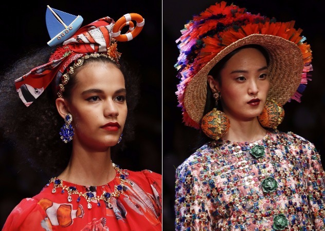 D&G這次直接把帆船和救生圈放在頭上,搭配上頭巾其實很有趣,但同時又搭了一條寶石髮圈,各種混搭令人看得眼花撩亂,而右邊像煙火般的帽子也很精彩,搭配上燈籠款耳環,令人不禁開始想,要氣場多強的人才能駕馭這一整組穿搭啊!