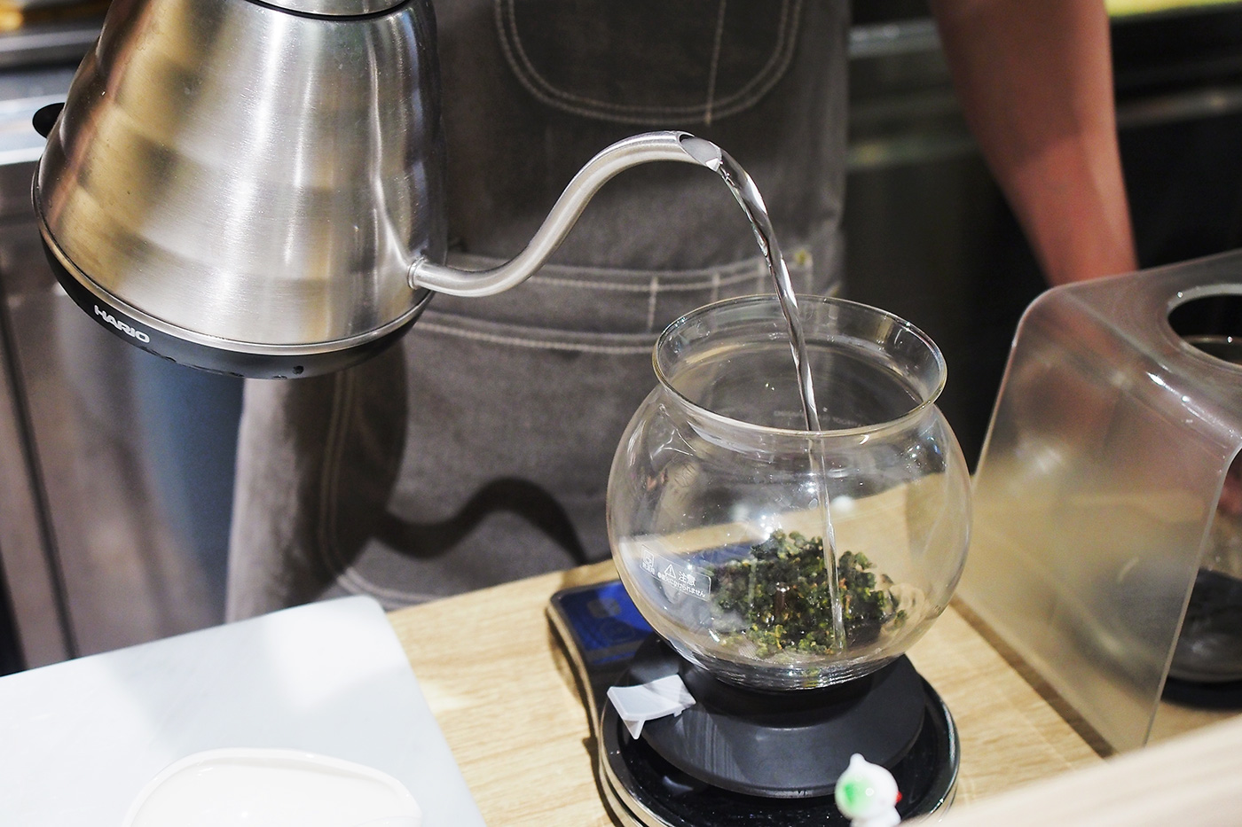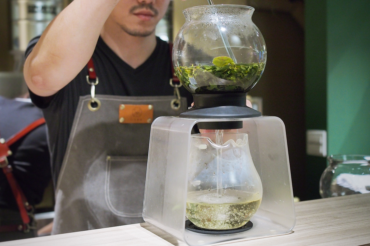 2. 使用類似沖煮咖啡的虹吸式茶壺取代傳統台式茶具,注入滾開熱水時可以清楚看到片片茶葉延展舞動貌。