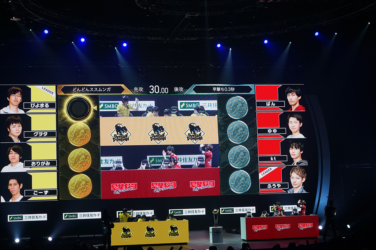 現場跟著1 萬 5 千人(兩天活動入場人數 4 萬 5 千人)同時親眼目睹 8 強互相比拚,贏者震臂歡呼、輸者落下眼淚,我深刻體認到,「勝利」除了運氣與際遇,更需要戰略與技巧,你必須標示出位置、時間,了解相對關係之後,才能知道每一步要怎麼走,最好例證就是冠軍 どんどんススムンガ。不只以 0.022 秒擊敗早撃ち 0.3 秒,在與 Cats的冠亞軍之賽,最後「剎那+小雪」的卡點,位置角度剛剛好,讓全場觀眾與後台其他選手都發出震耳欲聾的驚呼。就像冠軍隊隊長 ぴよまる 受訪時所說:「當然要先攻,但後攻的時候我們集合其他隊伍不要的角色,快速編隊,若是遲疑,整局就毀了。」