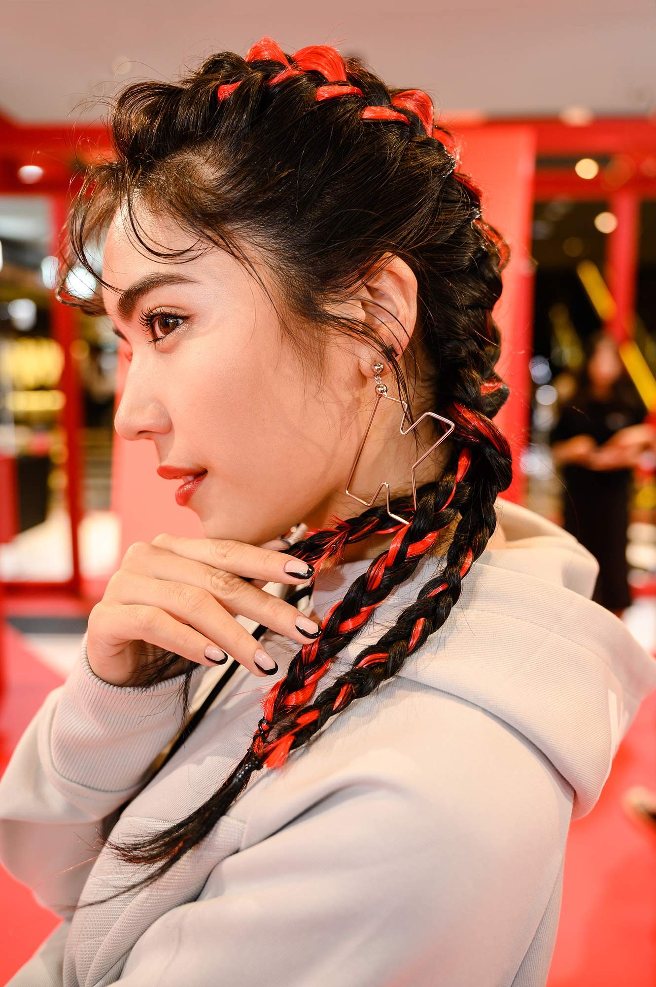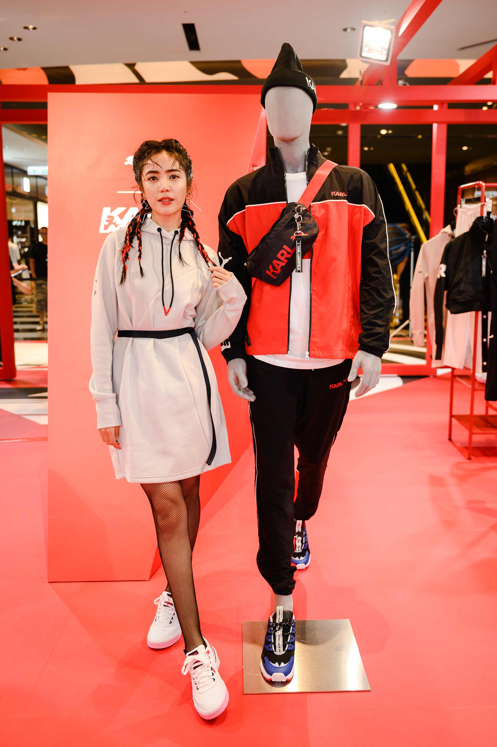 「我今天整個裝扮緊扣著 Karl Lagerfeld,黑白的經典形象,用上一點紅,讓整個人可以跳出來,你看我的頭髮,靈感來自腳上這雙 PUMA CALI by KARL,還有我身上這件長版運動衫,背面拉鍊拉開的顏色,雖然是粉,但不是那麼高調粉,其實啊,我是個粉紅控。」
