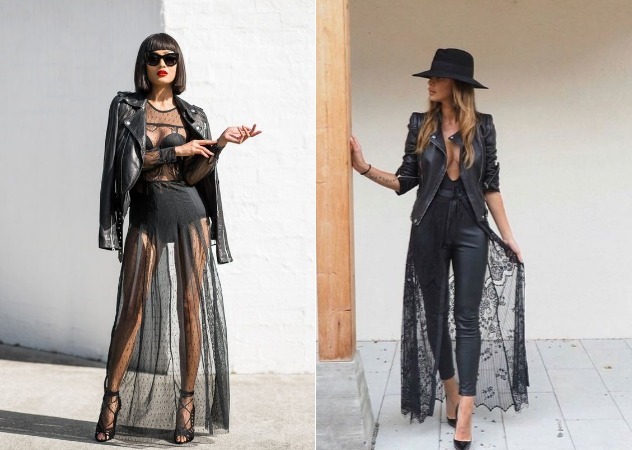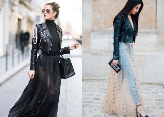 這是小編個人最喜歡的穿法之一,因為皮衣的帥氣碰撞上紗裙的柔美,本來就會有一種衝突的美感,率性與女人味兼具真的很好看,看看右下仙女劉亦菲的打扮,是不是很想複製貼上。