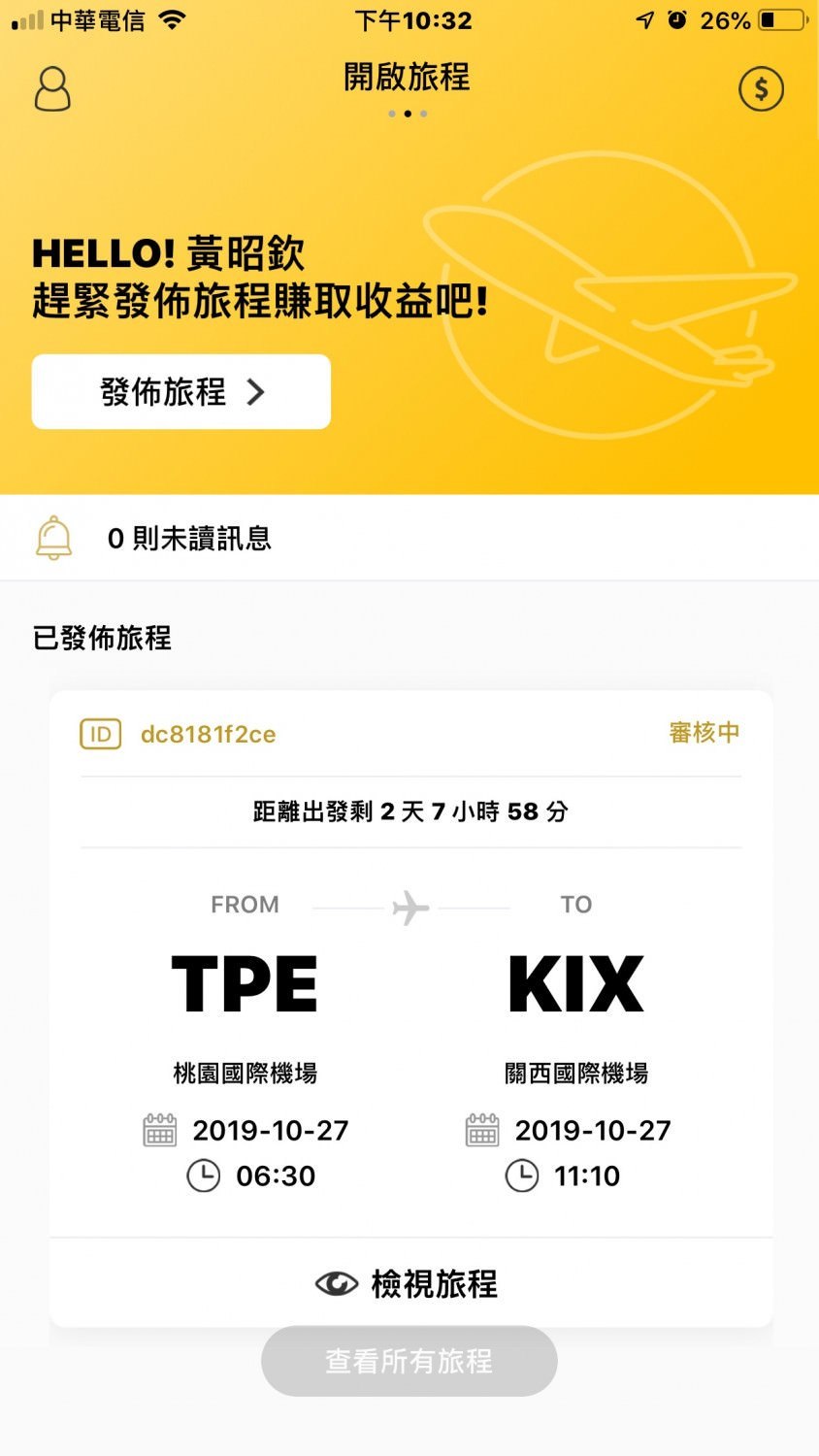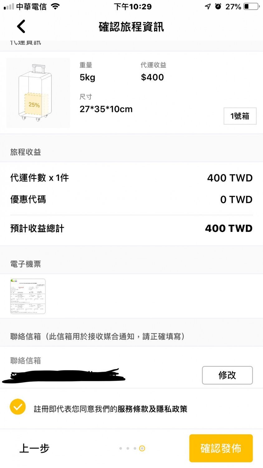 實際嘗試來接代運單看看: 我選擇的最小的空間,上傳電子機票、輸入聯絡信箱,然後按確認發佈。