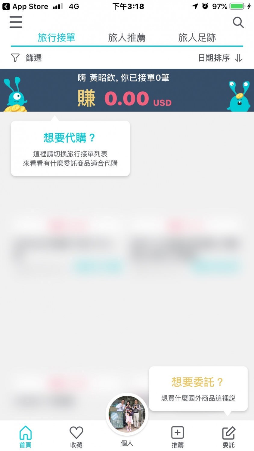 順買APP的介面很簡單易懂,第一次進入也會有新手指示,如果是想要接單的人,那麼就點選左上角進行代購接單,想要委託人幫你買東西的話,就點擊右下角的【委託】圖示。