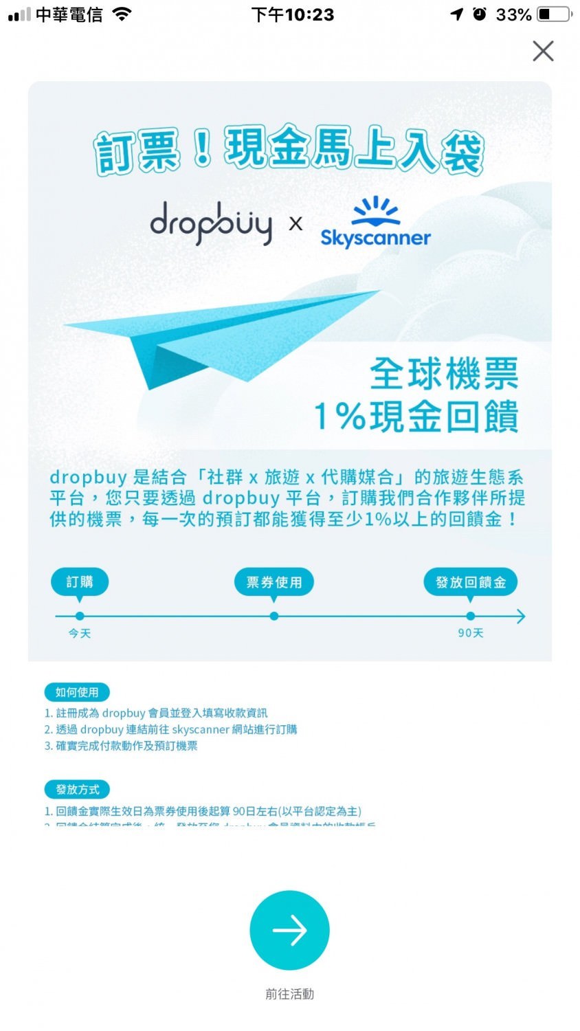 購買機票的,就是知名的 Skyscanner 了,也是一樣有回饋。