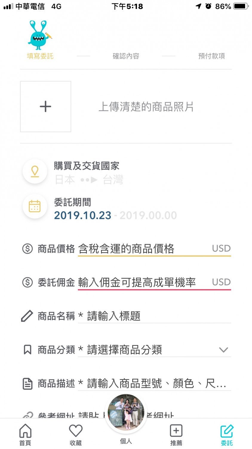 如果點擊委託的話,就會出現像上面這樣的介面,基本上填寫的商品項目越清楚、照片資訊越清晰,那麼代購旅客將會越容易知道並且協助你購買,當然啦…如果你願意付出的佣金越高,想要幫忙代購的人一定更多的。