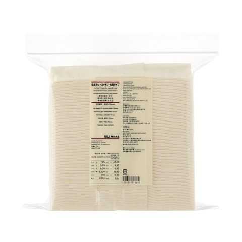 重點就是它的尺寸夠大且厚實,幾乎可以覆蓋整個臉頰,有些人甚至會把1片撕成4片來使用。一包有135片,之前日本無印還降價100日圓呢! 用起來一點也不心疼,可以舒適且大方地使用。大,柔軟,未經漂白,且對皮膚相當柔和。