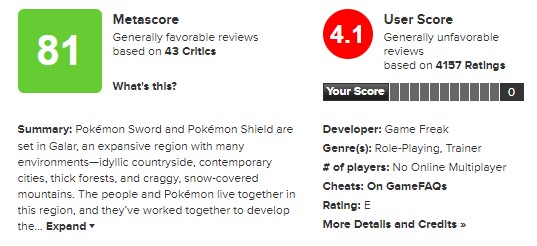 ▲ 《寶可夢劍》的玩家評分僅4.1分,《寶可夢盾》更是只有3.6分 Photo Source