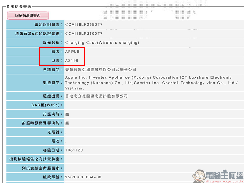 而目前 Apple 官方未單獨販售、只會在消費者購買 AirPods Pro 搭配的無線充電盒(型號 A2190),在幾天前才剛通過 NCC 認證: