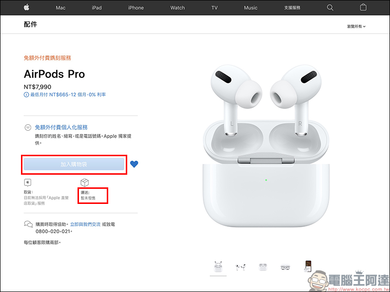 在台灣正式開賣前,即便進入 AirPods Pro 購買頁面後,仍然是無法加入購物袋的。這次 AirPods Pro 也延續過去 AirPods 的慣例,於 Apple 官網線上訂購的消費者,可享有免額外付費鐫刻服務,可以客製化自己喜愛的文字、數字: