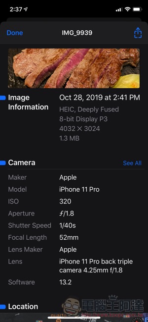 有意思的是,夜間拍攝模式 Metapho 會在影像資訊上顯示 Night Mode,不過 Deep Fusion 卻是使用「Deeply Fused」而非直接使用其名稱。這裡不太確定為什麼要使用別的名稱,但個人認為它可能並非真的抓取到 Metadata,而是透過條件確認可能有啟動。