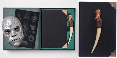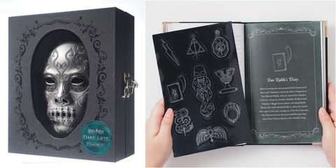 其中的食死人面具是黑魔王忠實擁護者必備,此面具並非特別設計來配戴使用,卻是每個黑魔法信徒不可或缺的道具珍藏及精美擺飾!另外更包含第二集《消失的密室》中登場的劇情關鍵:湯姆瑞斗日記本,除了可當一般筆記本使用,更收錄黑魔法暗黑風插圖、人物經典台詞,以及黑魔法重要物件的介紹。