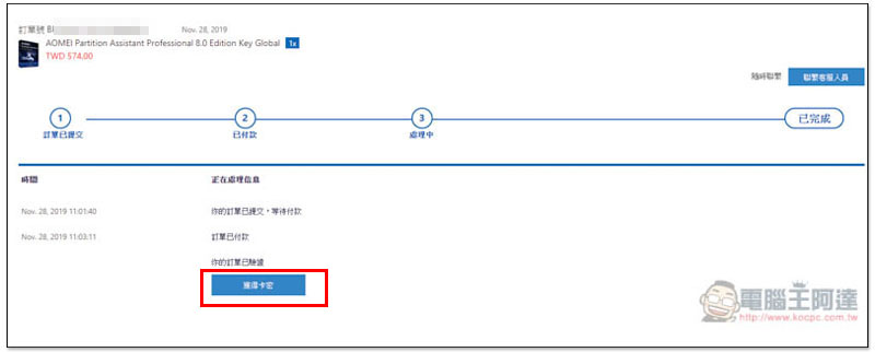 就會看到你剛剛訂購的軟體,序號在右側的查看訂單狀態裡面: