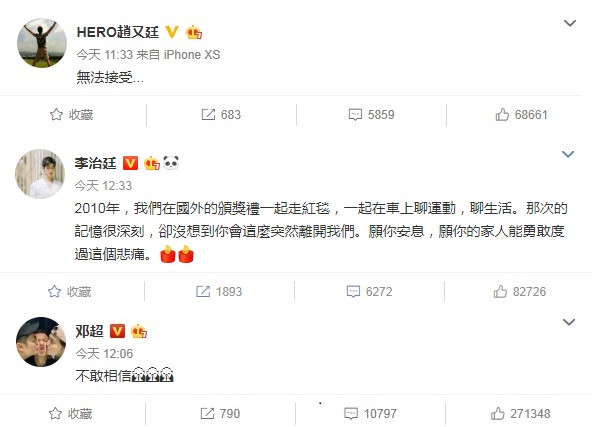 包含趙又廷、鄧超、鹿晗、李治廷...等人都發文悼念,趙又廷簡短四個字:「無法接受....」足以知道這消息是多麼突然,真的讓所有人都無法接受。