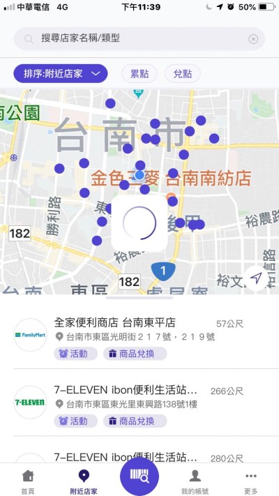 Happy Go App 也支援【尋找附近店家】的功能,只要在主畫面點擊下面的【附近店家】,就可以進行尋找。