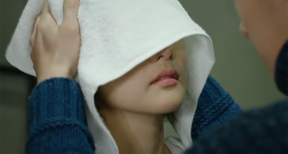 英信剛洗好澡出來,看見她頭髮濕濕的,政厚拿起毛巾幫她擦頭髮。英信的眼睛被毛巾蓋住,只露出嘴唇,擦著擦著政厚就心動啦~池昌旭的眼神實在是太殺了!